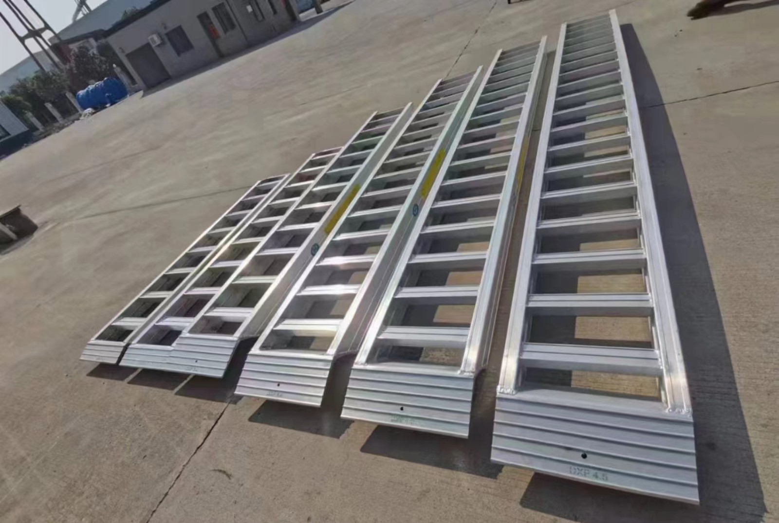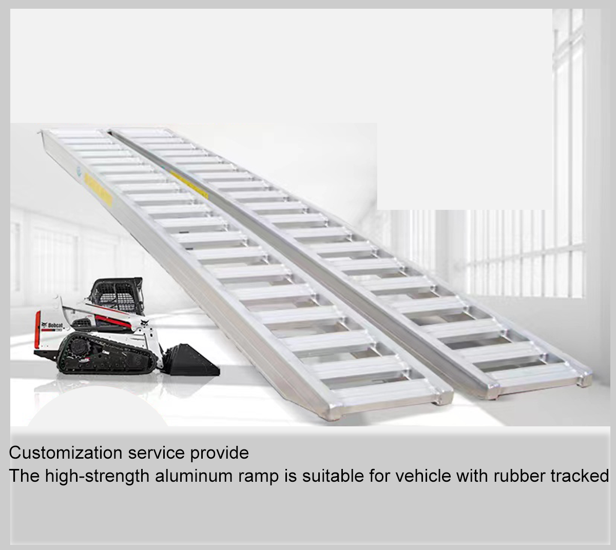 The bevel bar beam type ramp for rubber track machinery which is specially designed for the rubber track machine, which plays a key anti-slip effect, and also better reduces the self-weight of the aluminum ramp to achieve the best effect of light anti-slip.